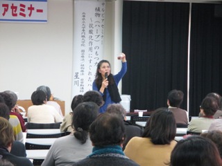 「ハーブ」という言葉を聞くと、ヨーロッパの植物というイメージが強いですが、実は昔から私たちの身近にある「薬草」のことで、さまざまな健康効果を持っています。講演では、フィトケミカルの抗酸化作用を中心にお話いただきました。身近な植物はたくさんありますが、特にその土地に根づいた植物がその土地の住民の身体に合うといいます。その点で、福崎名産の「もち麦」は本当に良い素材であり、先生自身ももち麦に注目し、活用してくださっているとのことでした。